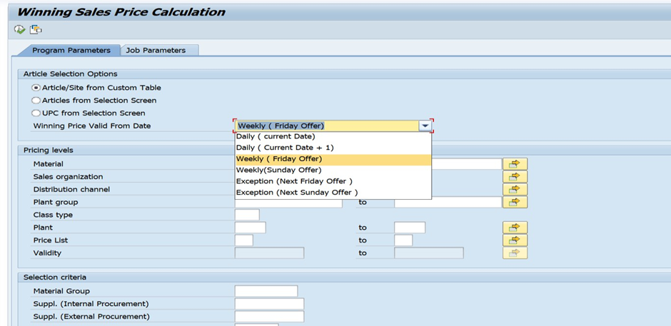 The wrapper program generates either on-screen winning price calculations for low-volume executions or background jobs for large-scale automated processing. Background jobs can be monitored using standard SAP job management tools, which provide detailed logs and spool outputs that record all relevant pricing calculation information.