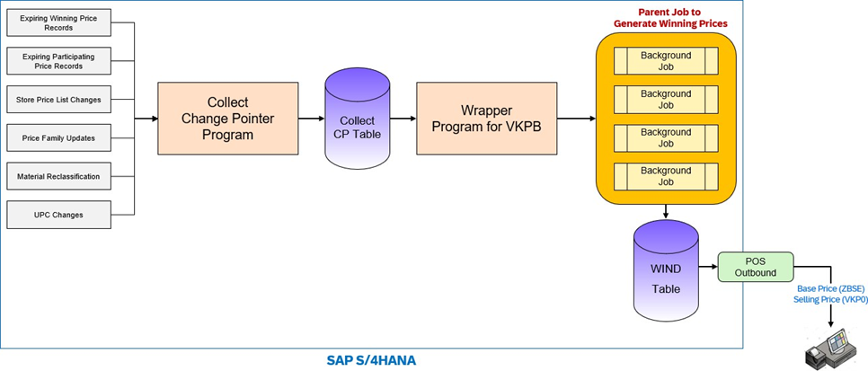 The change pointer custom table must be used to generate updated winning prices. The sales price calculation program is primarily designed for online execution, which makes it challenging to automate change pointer–driven data selection, price calculation, condition creation, and subsequent POS outbound processing.