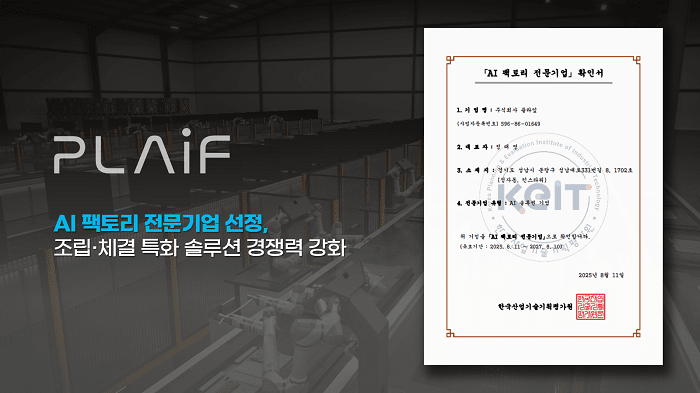 AI 기반 자율형 양팔로봇 솔루션 기업 플라잎(PLAiF, 대표 정태영)이 산업통상자원부와 한국산업기술평가관리원(KEIT)이 주관하는 ‘AI 팩토리 전문기업’으로 최종 선정됐다고 22일 밝혔다. 이로써 플라잎은 국내 제조 산업의 디지털 전환을 이끌 핵심 기업으로 발돋움할 기반을 마련했다.